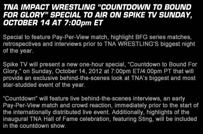 Countdown to Bound for Glory Check out all the Bound for Glory news at this special website or go the the TNA Official site. Share this: Click to share on Facebook (Opens in new window) Facebook Click to share on X (Opens in new window) X Click to share on Bluesky (Opens in new window) Bluesky Click to share on Telegram (Opens in new window) Telegram Click to share on WhatsApp (Opens in new window) WhatsApp Related