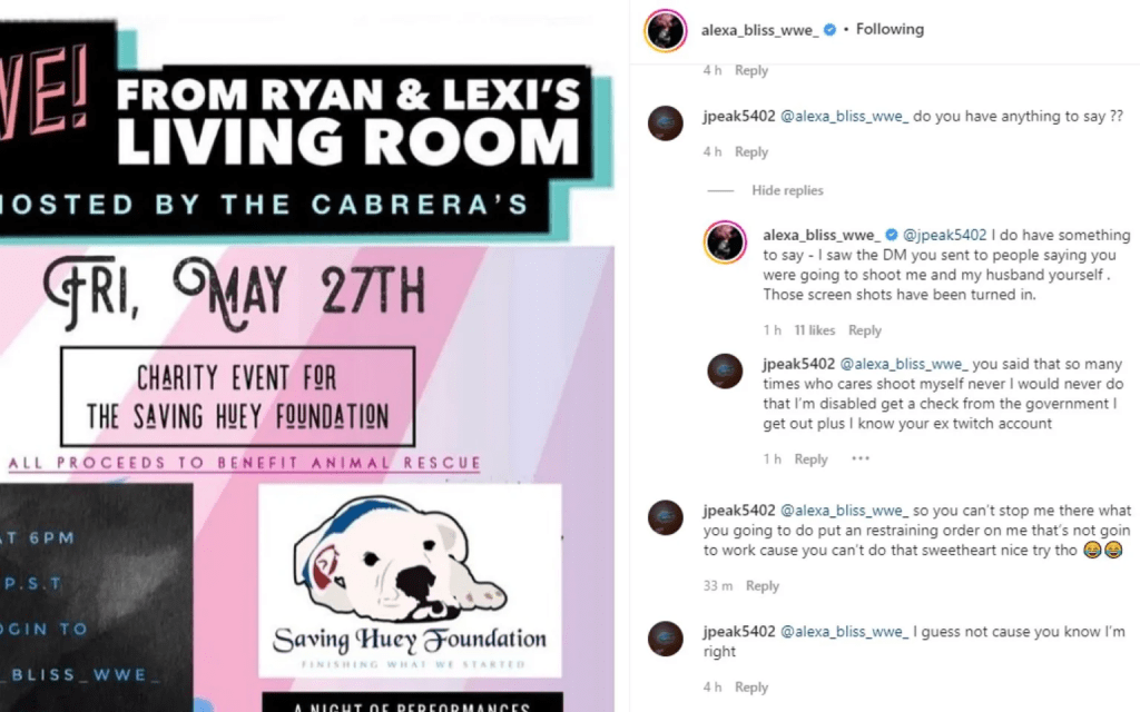 Alexa Bliss has dealt with her fair share of crazed fans over the years. On Tuesday night, Bliss exposed another such person for threatening to shoot her and her husband Ryan Cabrera.